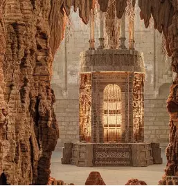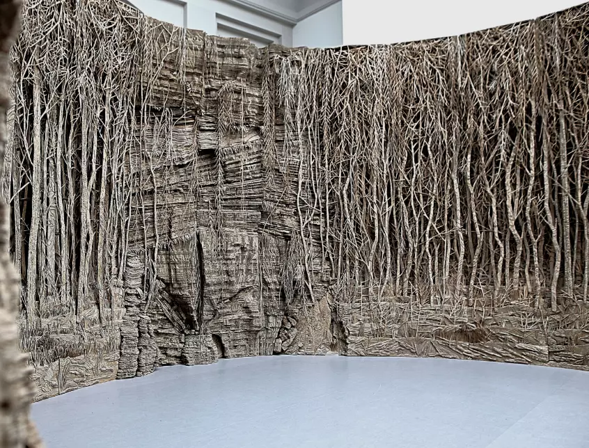 Encore une très belle exposition d’Eva Jospin jusqu’au 15 mars 2026 au Grand Palais. Le titre de l’exposition, « Grottesco« , s’inspire de la légende d’un jeune Romain tombé par hasard dans une cavité où il découvre des fresques oubliées de la Domus Aurea. À partir de ce palais enseveli, semblable à une grotte, naît le « grotesque » dont Eva Jospin tire le fil : un style où le végétal, l’architectural et le fantastique s’entrelacent. Le parcours invite à une traversée dans un monde à part : promontoire, cénotaphe, grotte, ruines et forêt se succèdent, transformant sans cesse la perception et révélant de nouveaux motifs. Le carton -média pauvre- est magnifié, une traversée immersive de ces paysages.