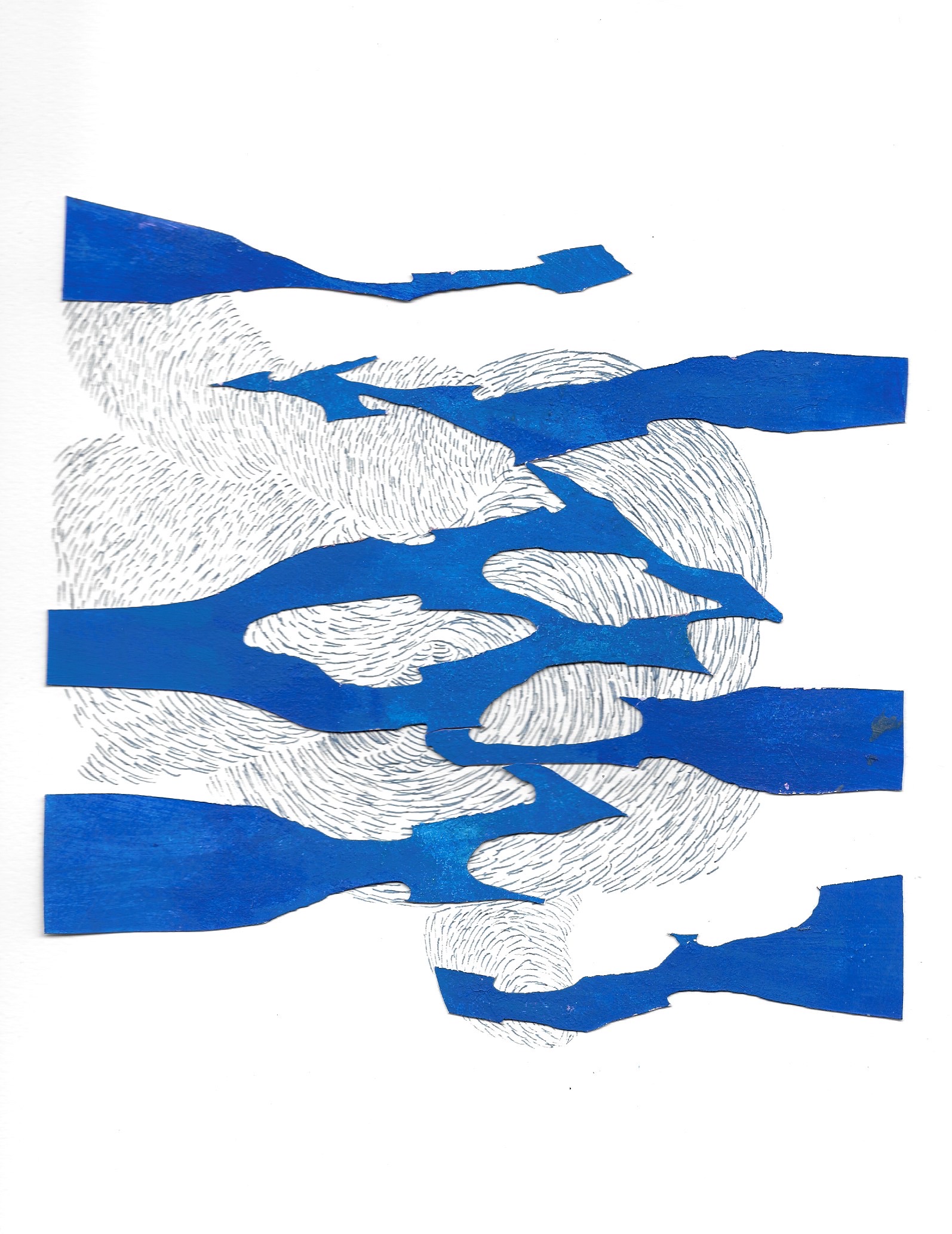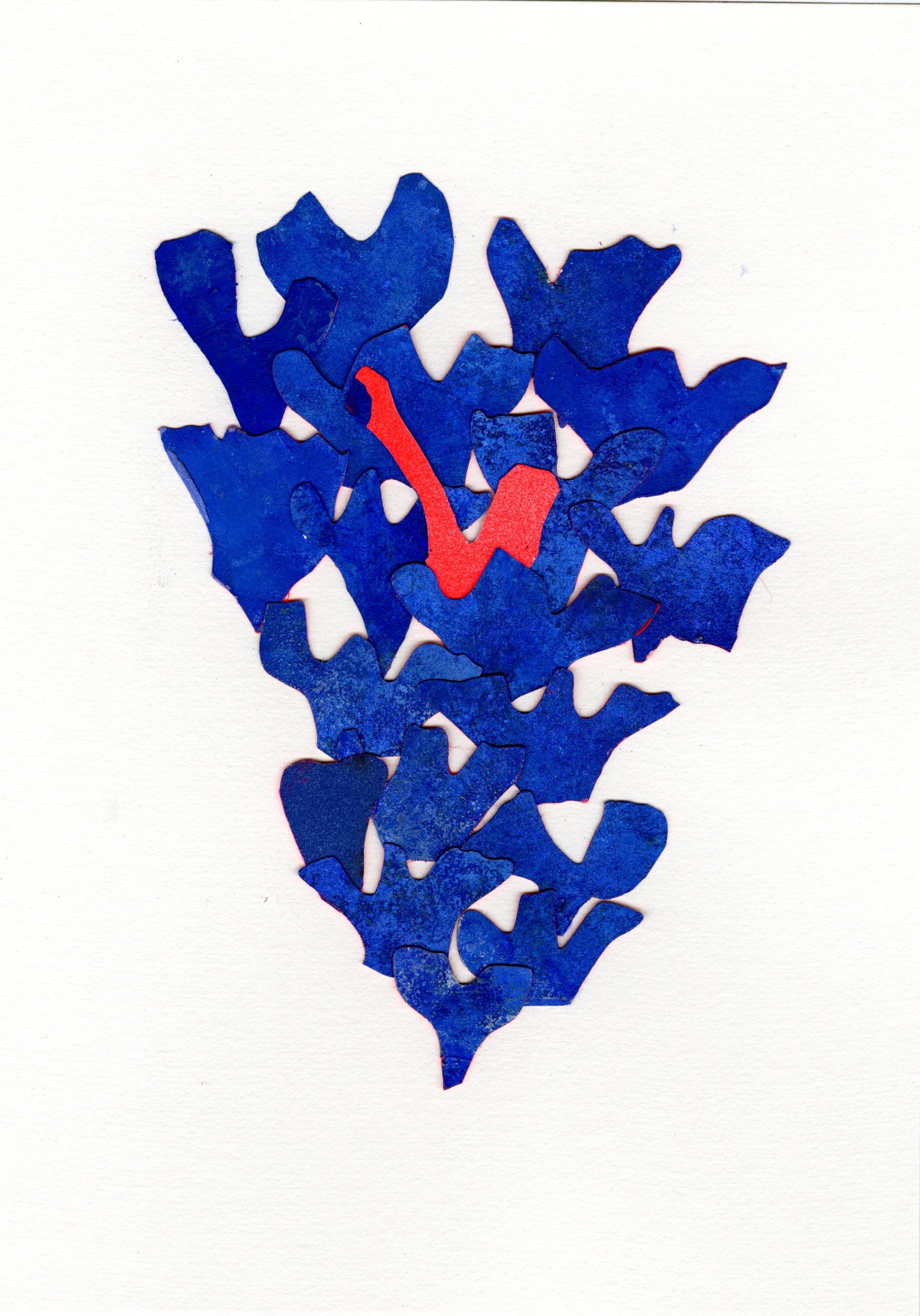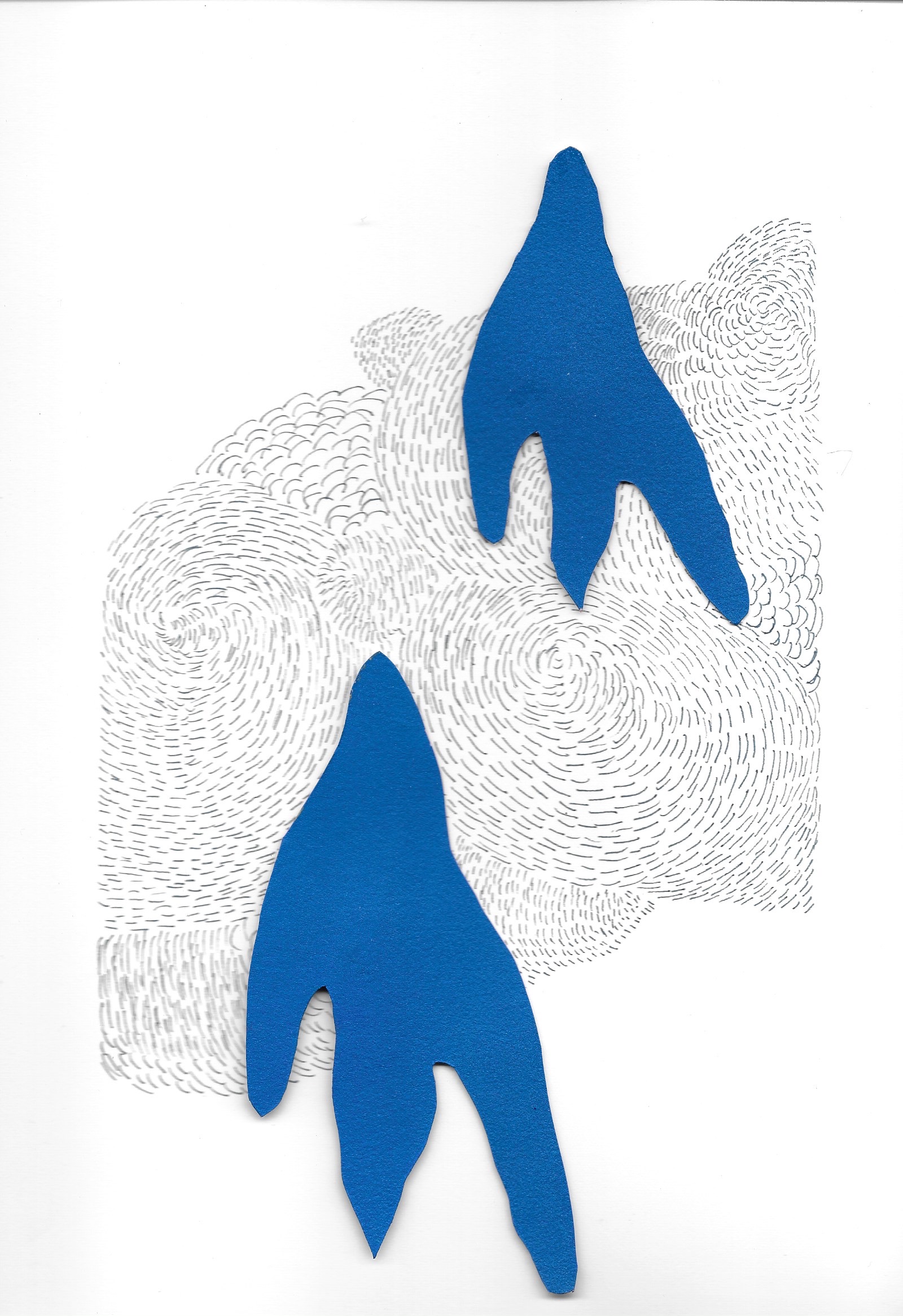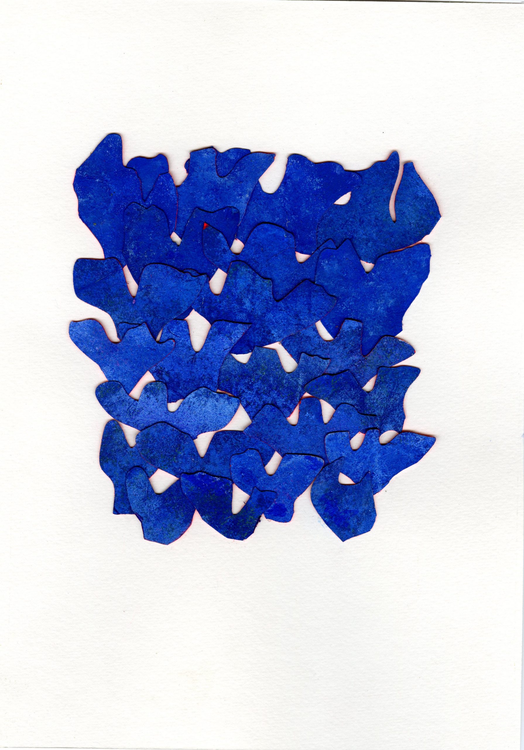 Murmures ( ou murmuration en anglais) définit l’envol des nuées d’oiseaux. Ils vibrent et virevoltent dans un ballet magique, comme s’ils ne faisaient qu’un créant une forme changeante à chaque instant. Un mouvement collectif plein de vie face à la mort, où tout oscille entre géométrie et organique, solide et fluide, matière et vaporeux. Sans leader, chaque étourneau réagit aux sept voisins les plus proches, créant une onde de mouvement dans toute la nuée. Comment rendre compte des métamorphoses de la Nature? Je réalise des assemblages et des collages de papiers découpés pour exprimer ces paradoxes
