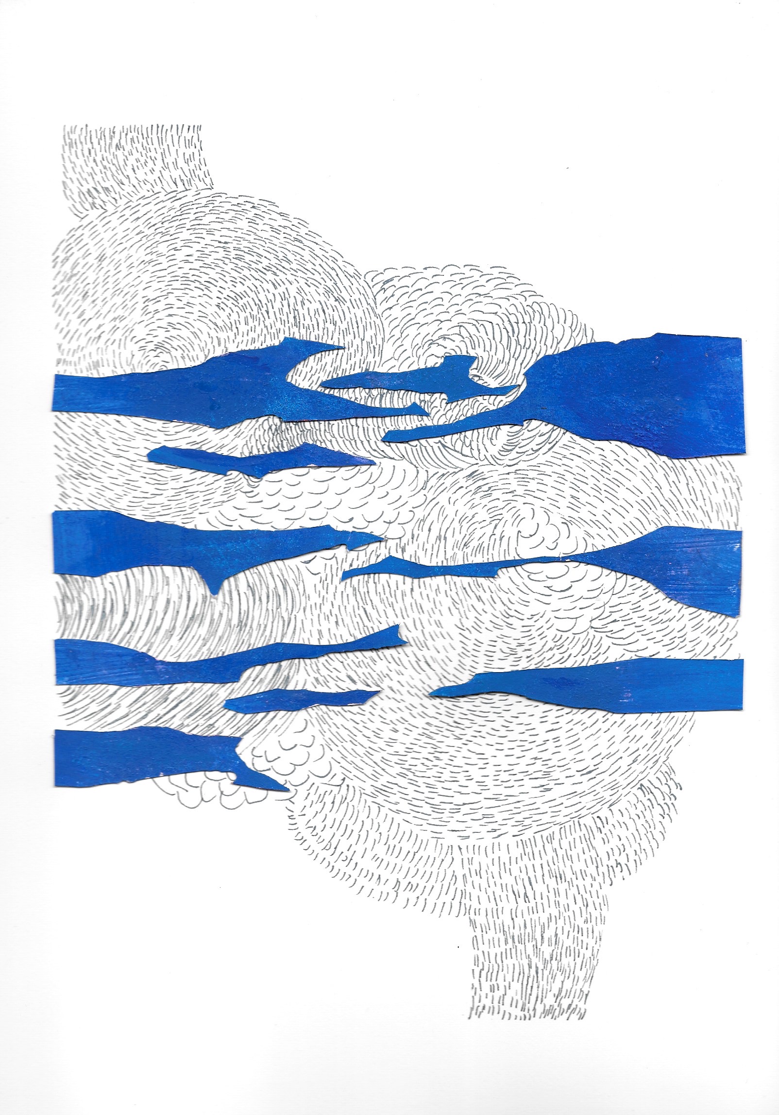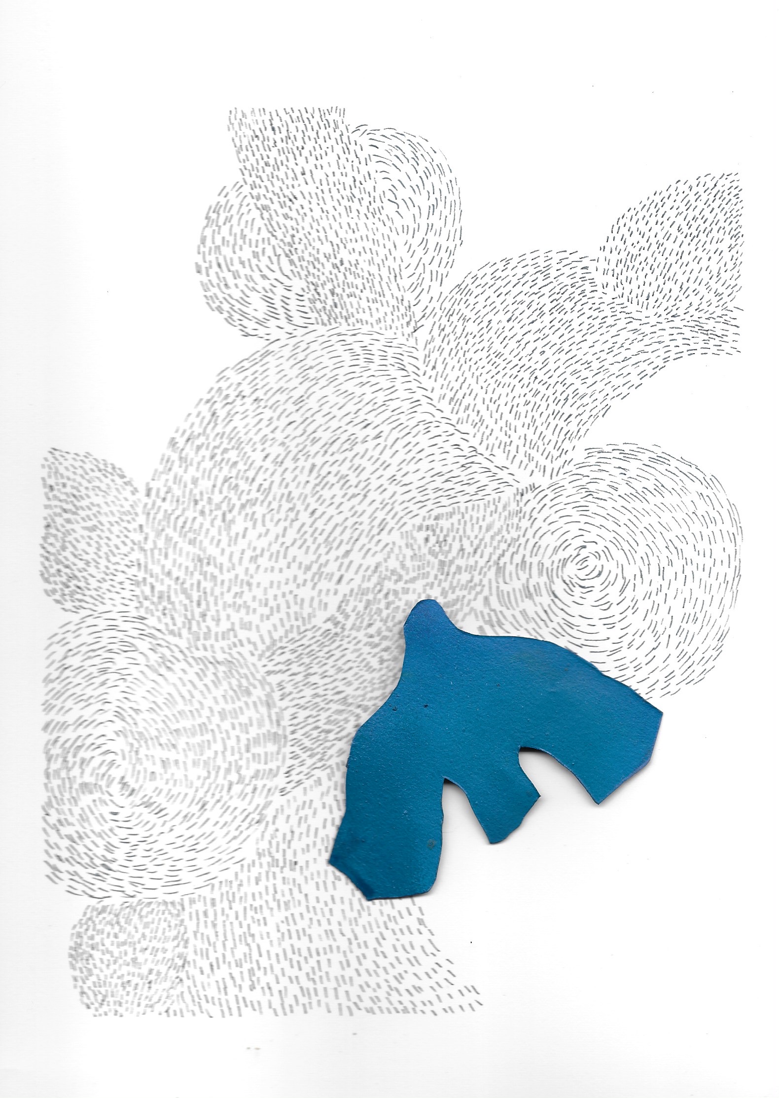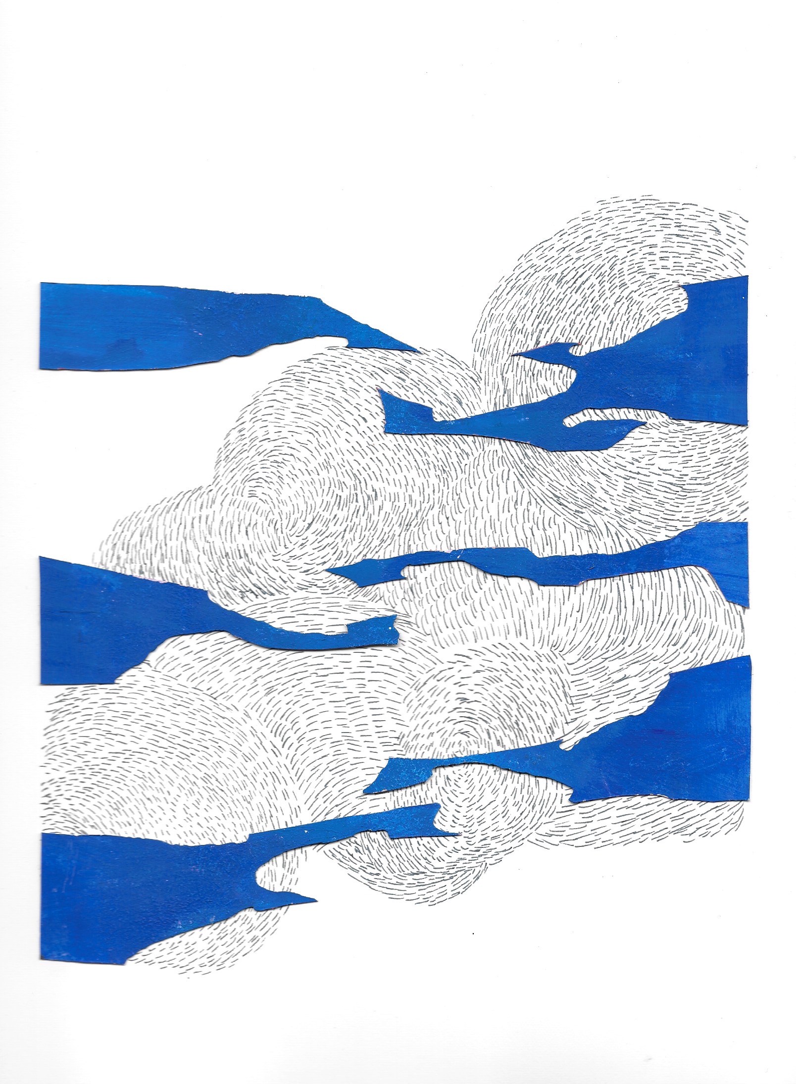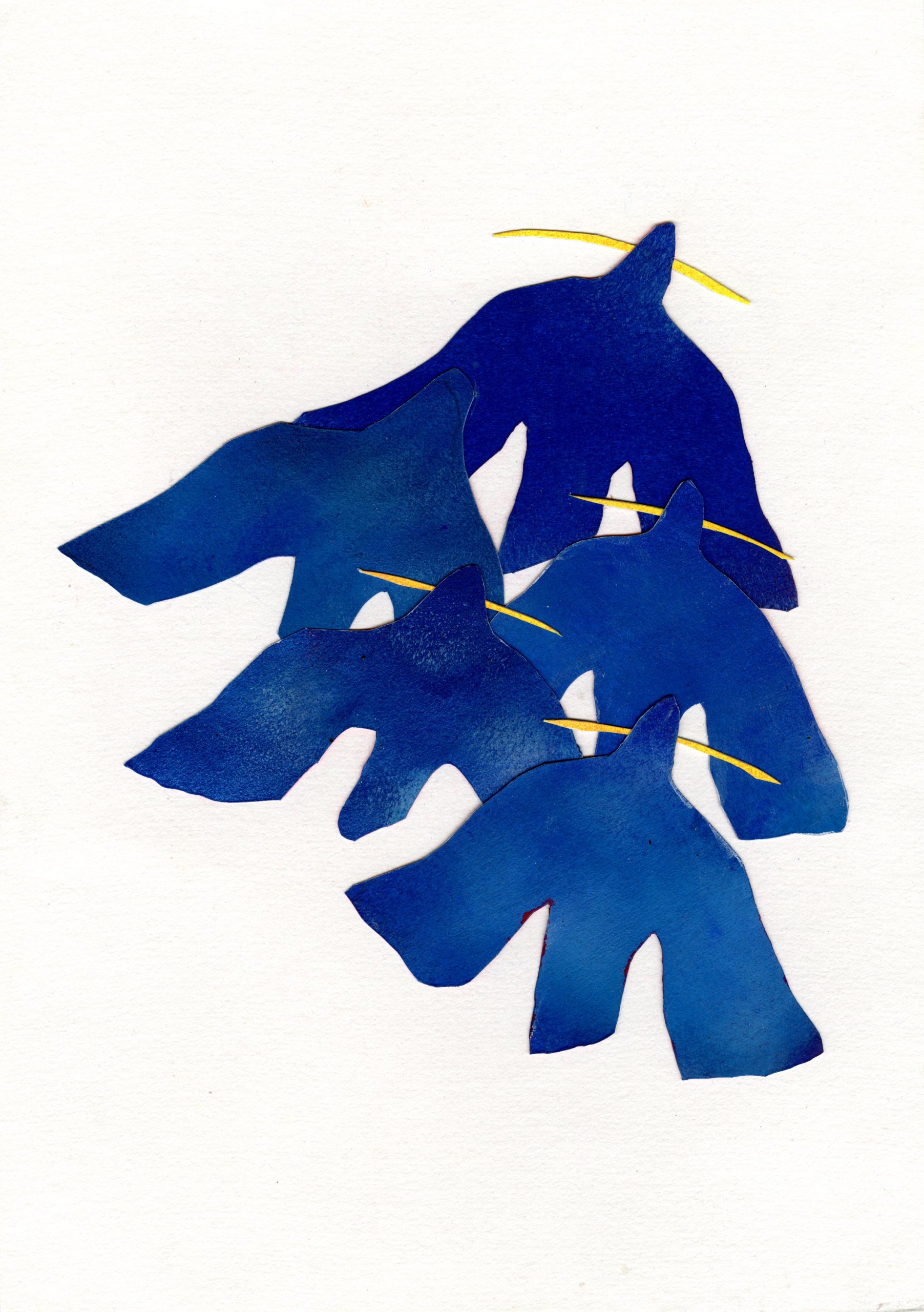 Murmures ( ou murmuration en anglais) définit l’envol des nuées d’oiseaux. Ils vibrent et virevoltent dans un ballet magique, comme s’ils ne faisaient qu’un créant une forme changeante à chaque instant. Un mouvement collectif plein de vie face à la mort, où tout oscille entre géométrie et organique, solide et fluide, matière et vaporeux. Sans leader, chaque étourneau réagit aux sept voisins les plus proches, créant une onde de mouvement dans toute la nuée. Comment rendre compte des métamorphoses de la Nature? Je réalise des assemblages et des collages de papiers découpés pour exprimer ces paradoxes