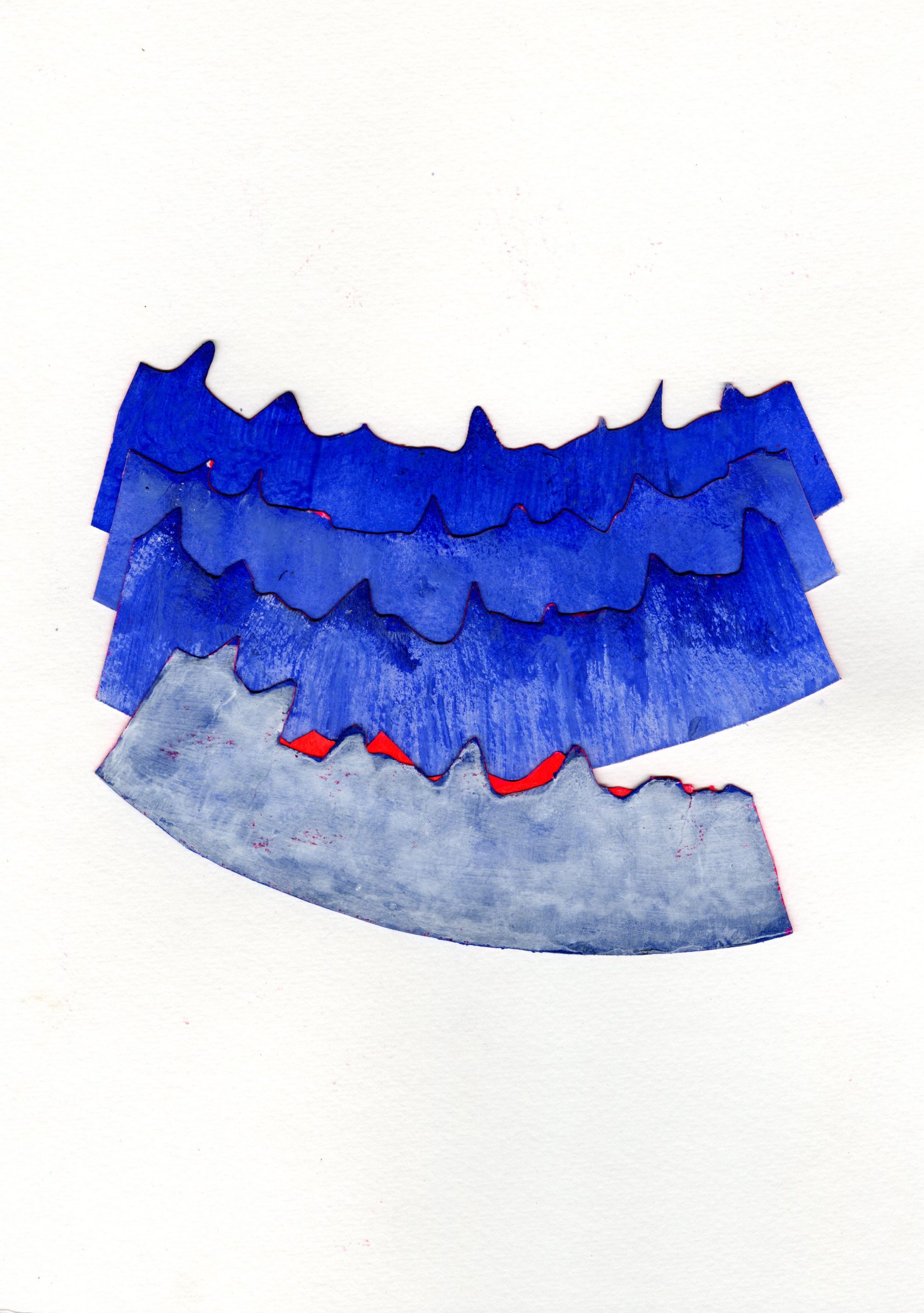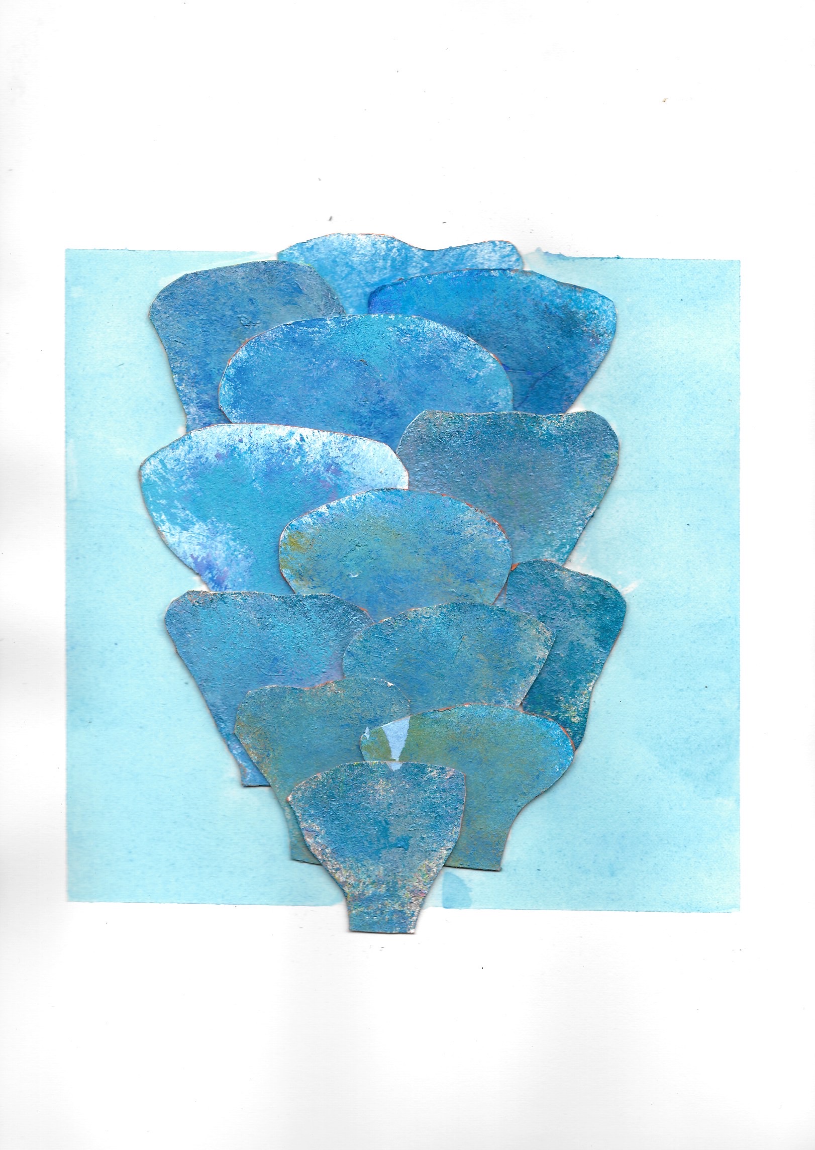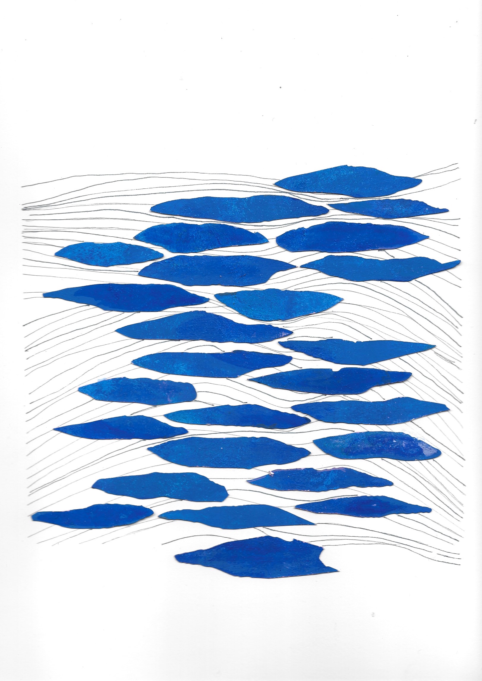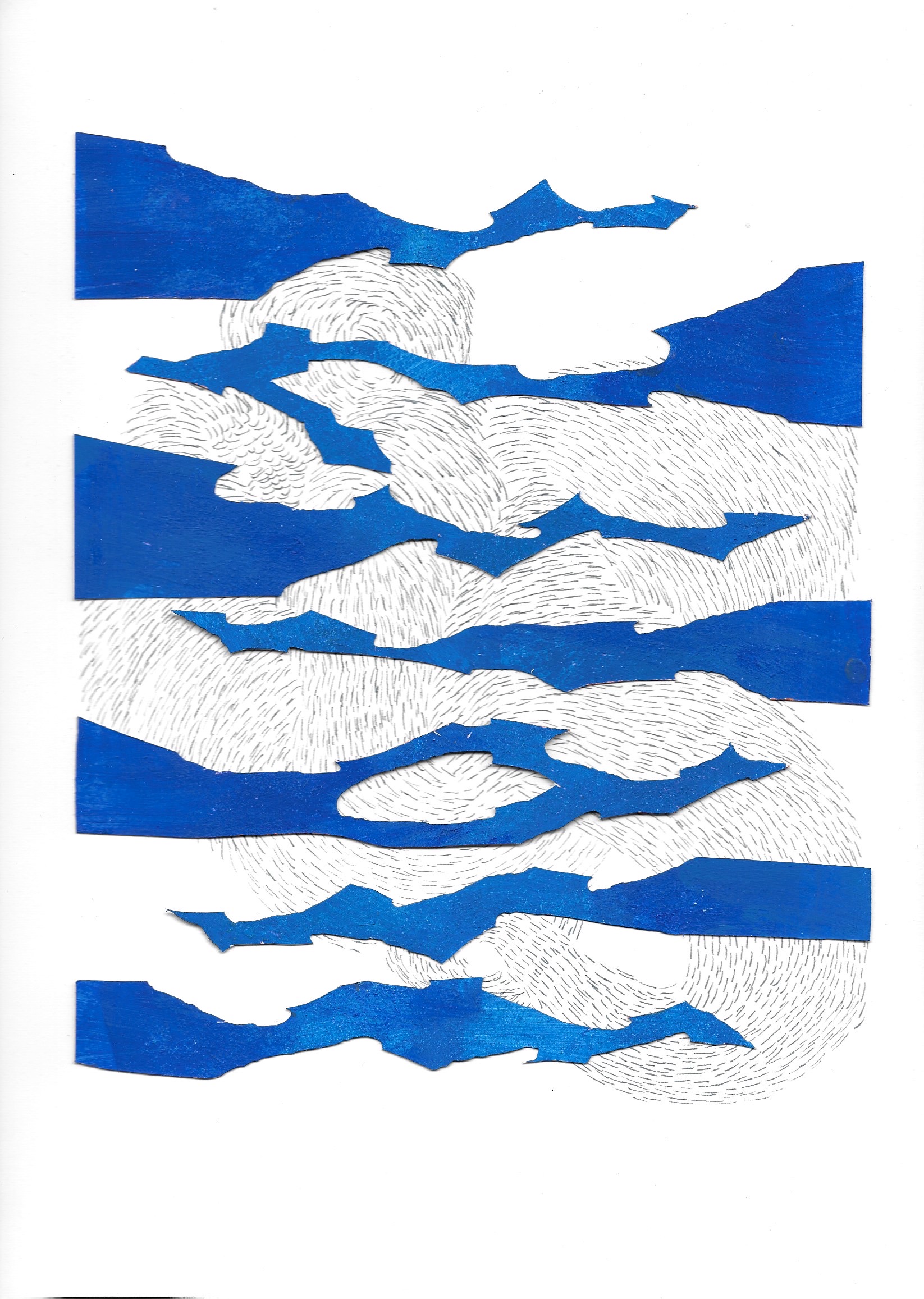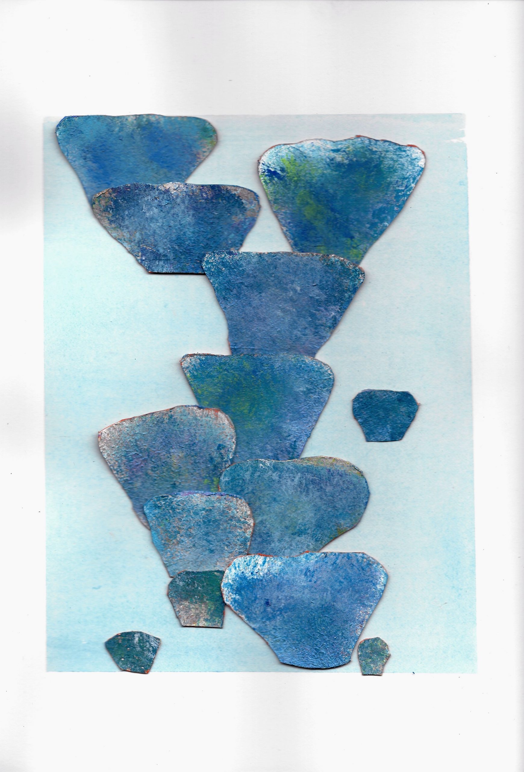 Murmures ( ou murmuration en anglais) définit l’envol des nuées d’oiseaux. Ils vibrent et virevoltent dans un ballet magique, comme s’ils ne faisaient qu’un créant une forme changeante à chaque instant. Un mouvement collectif plein de vie face à la mort, où tout oscille entre géométrie et organique, solide et fluide, matière et vaporeux. Sans leader, chaque étourneau réagit aux sept voisins les plus proches, créant une onde de mouvement dans toute la nuée. Comment rendre compte des métamorphoses de la Nature? Je réalise des assemblages et des collages de papiers découpés pour exprimer ces paradoxes