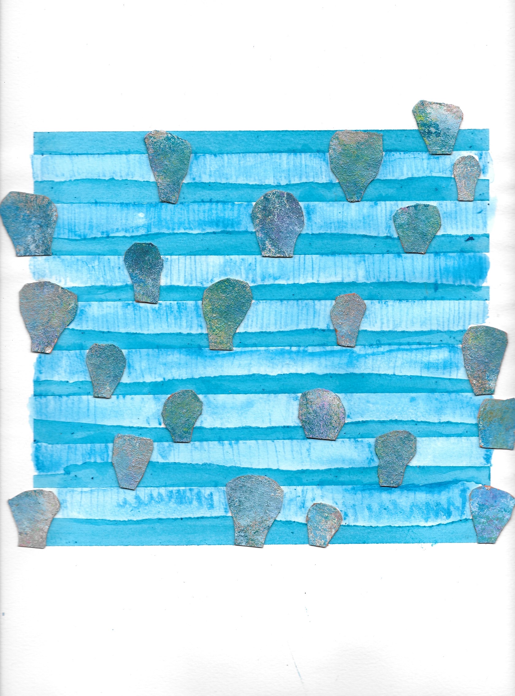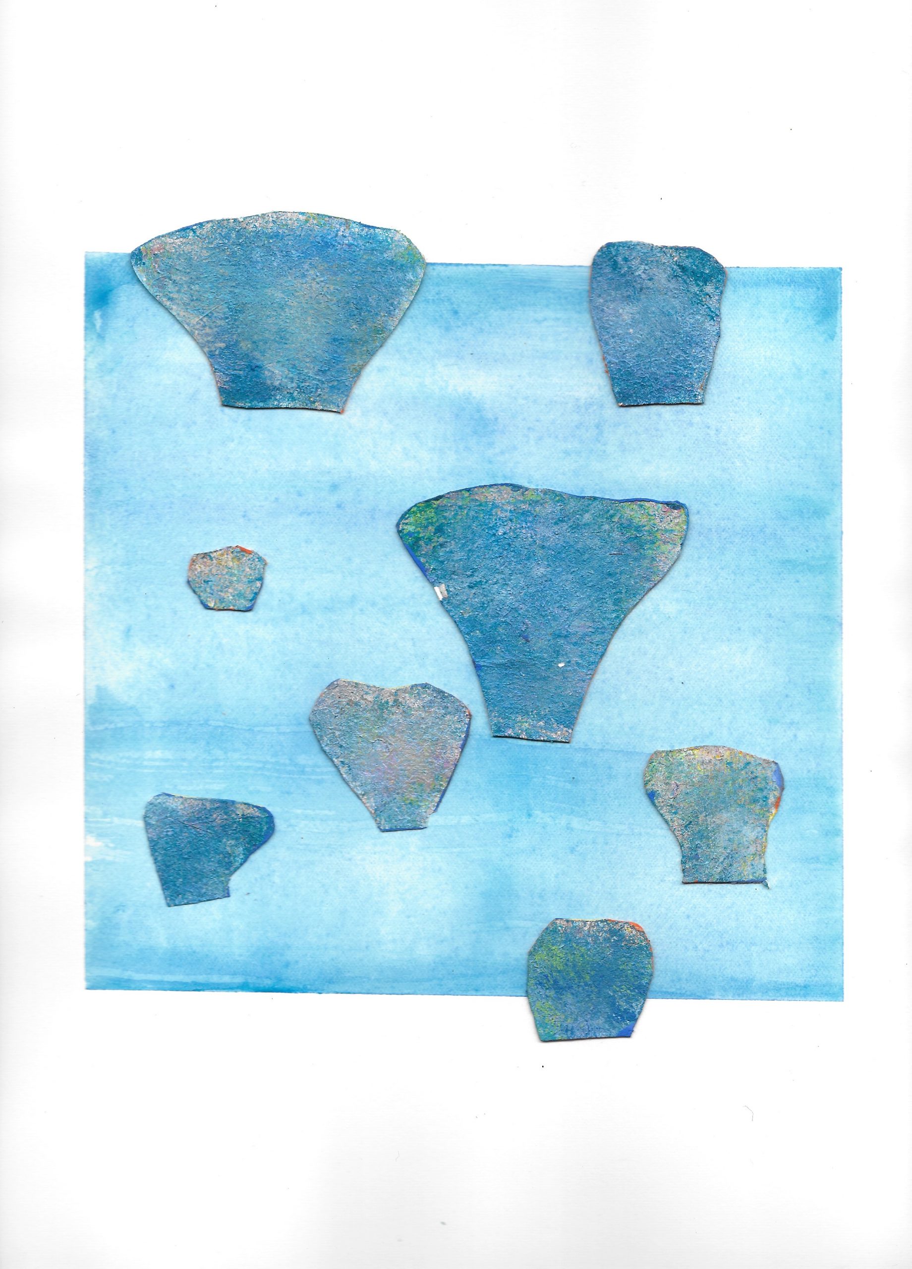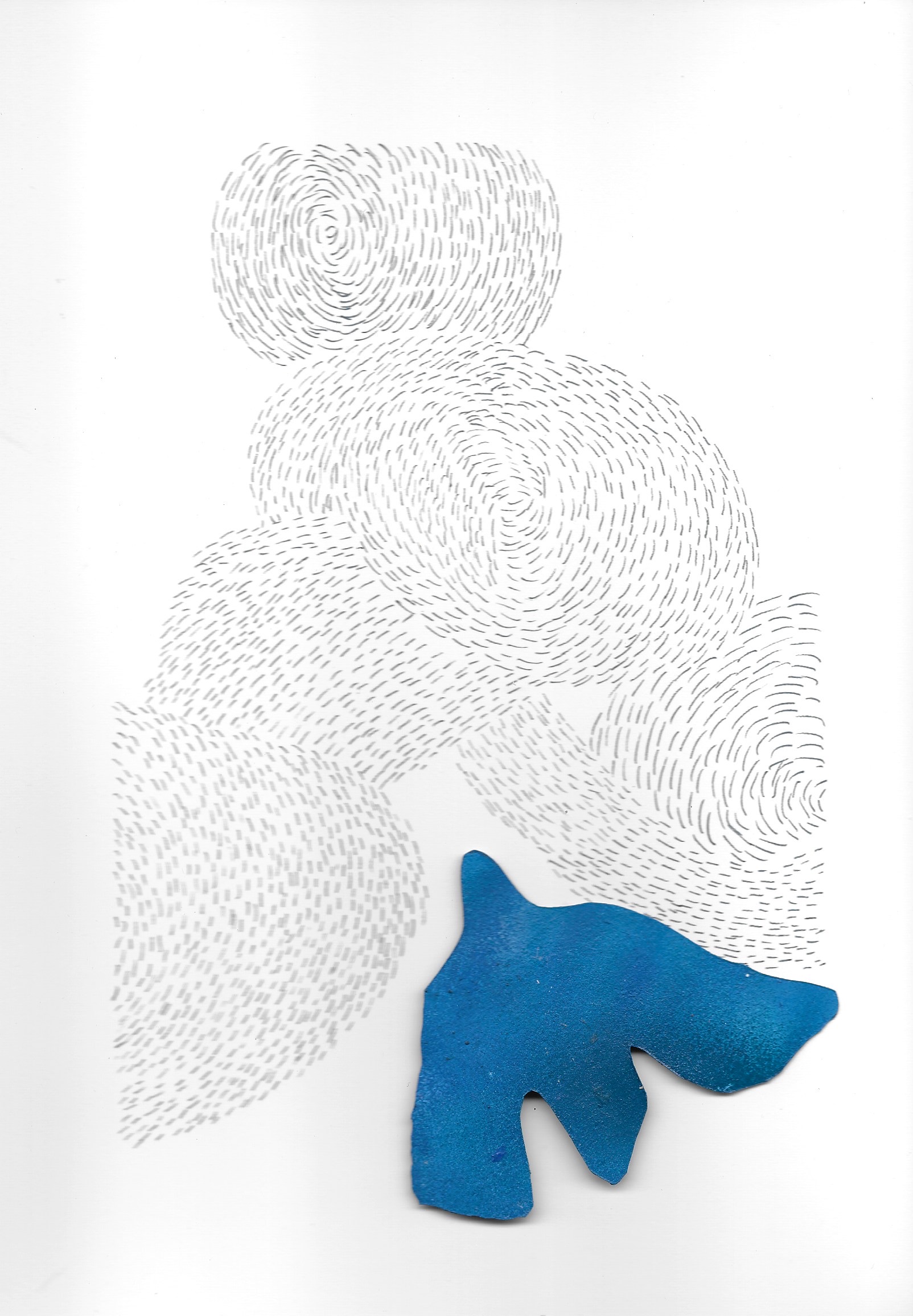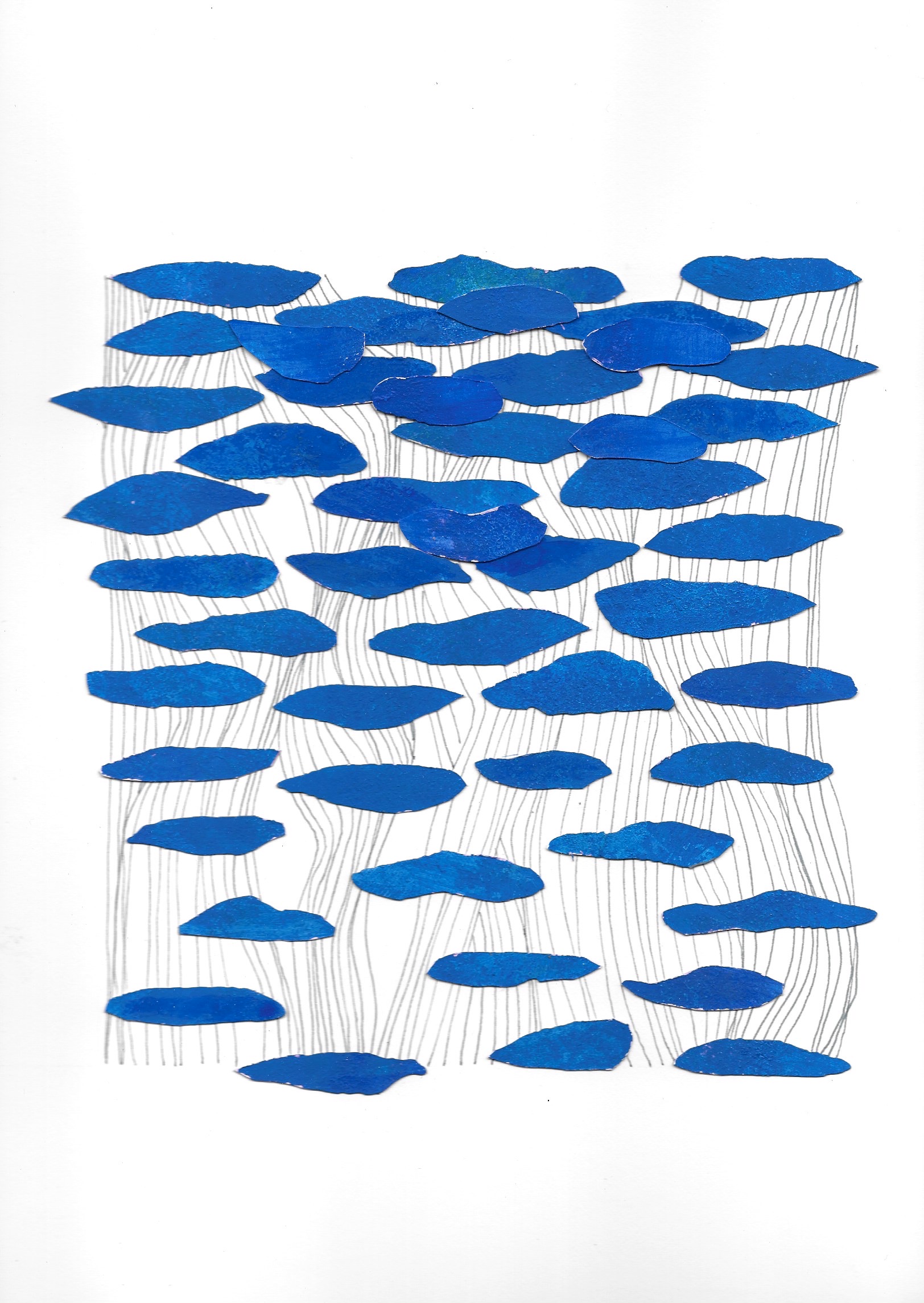 Murmures ( ou murmuration en anglais) définit l’envol des nuées d’oiseaux. Ils vibrent et virevoltent dans un ballet magique, comme s’ils ne faisaient qu’un créant une forme changeante à chaque instant. Un mouvement collectif plein de vie face à la mort, où tout oscille entre géométrie et organique, solide et fluide, matière et vaporeux. Sans leader, chaque étourneau réagit aux sept voisins les plus proches, créant une onde de mouvement dans toute la nuée. Comment rendre compte des métamorphoses de la Nature? Je réalise des assemblages et des collages de papiers découpés pour exprimer ces paradoxes